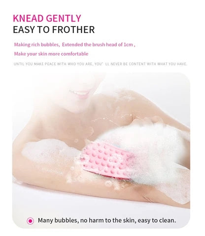 acessórios de banho simples para uma esfoliação corporal personalizada. Há uma esponja de silicone de um lado para  massagear as costas para esfoliar sem ferir a pele o outro lado é uma estrutura oval, que pode massagear cada centímetro de sua pele e  promover a circulação sanguínea.